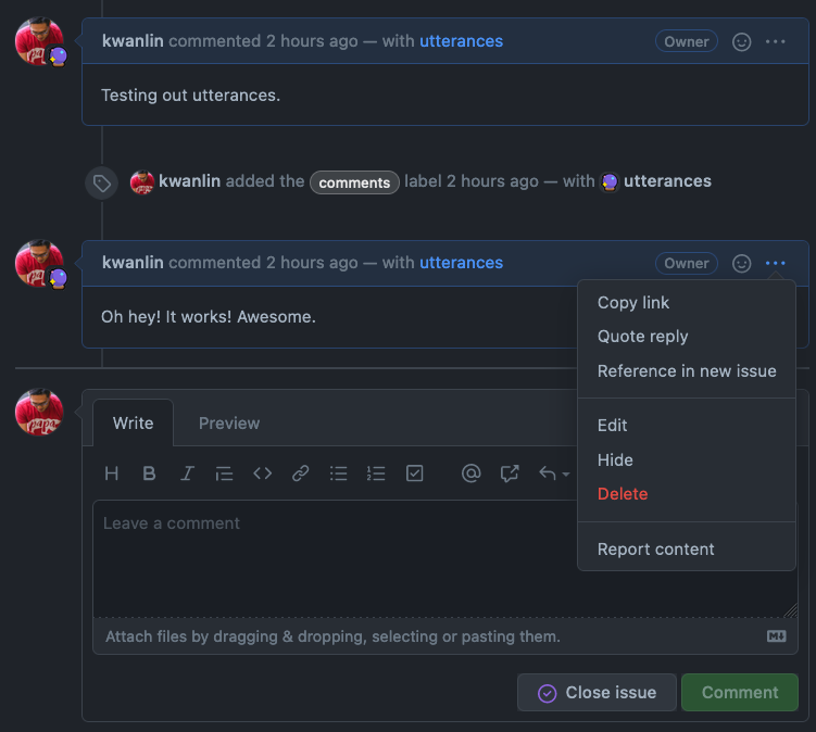 With that, the decision became clear: Utterances would be the way to implement commenting on this site.